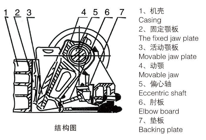 該系列破碎機工作方式為曲動擠壓型,其工作原理是:電動機驅動皮帶和皮帶輪,通過偏心軸使動顎上下運動,當動顎上升時肘板與動顎間夾角變大,從而推動動顎板向固定顎板接近,與其同時物料被壓碎或劈碎,達到破碎的目的;當動顎下行時,肘板與動顎夾角變小,動顎板在拉桿,彈簧的作用下,離開固定顎板,此時已破碎物料從破碎腔下口排出。隨著電動機連續轉動而破碎機動顎作周期運動壓碎和排泄物料,實現批量生產。